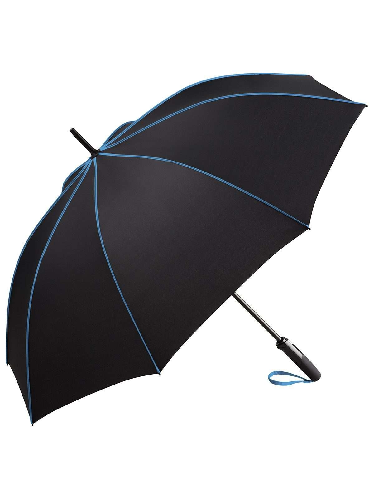 Copertura: 100% poliestere, manico: plastica, asta: acciaio, plastica. Ombrello di media misura con apertura automatica, bacchette flessibili in fibra di vetro, pannelli di colore nero con bande in contrasto colorate, manico nero soft-touch. Diametro: 115 cm, lunghezza da chiuso: 90 cm, 8 pannelli.