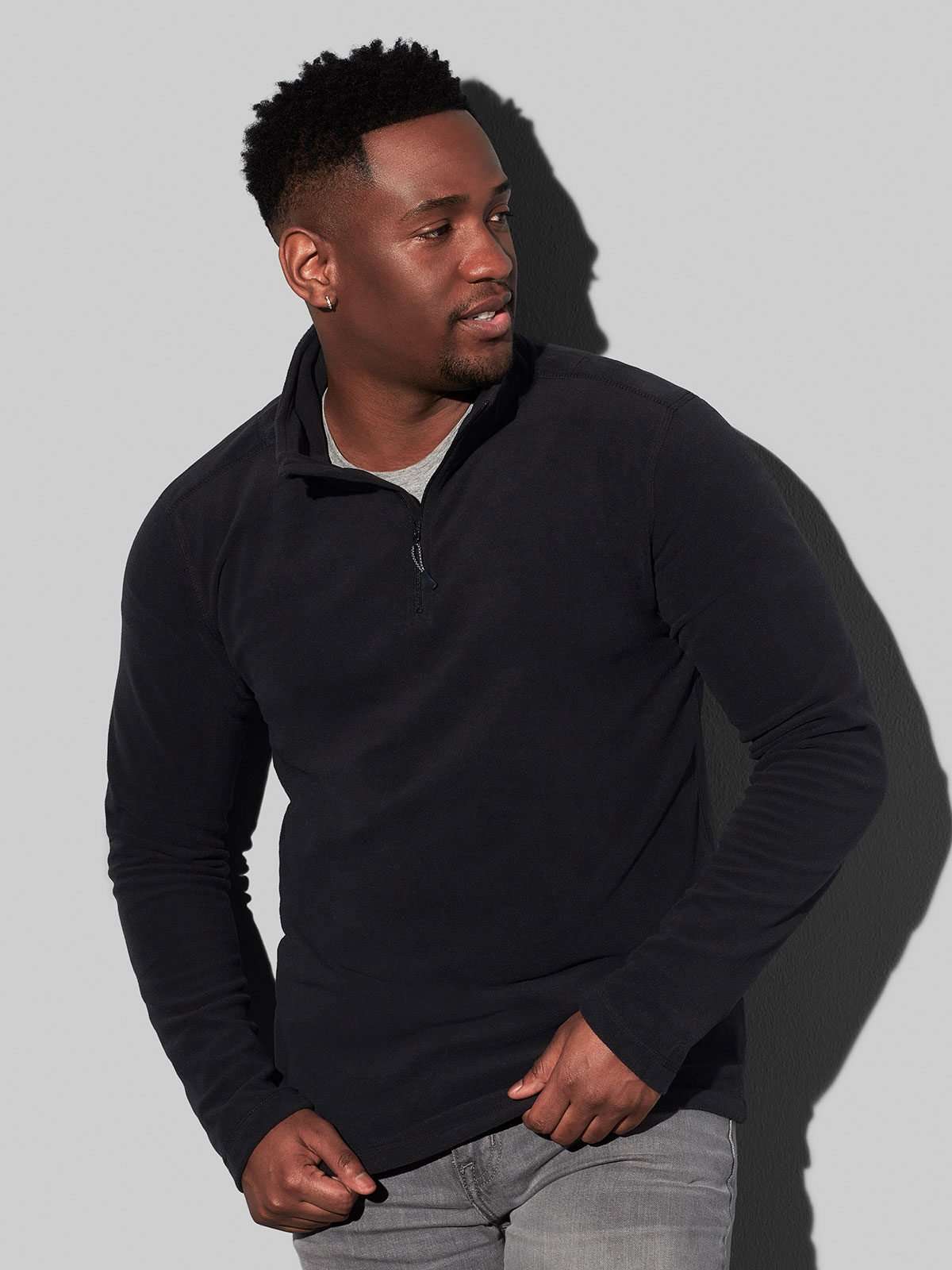 100% poliestere, anti-pilling micro-fleece. Pile con mezza zip tono su tono, cuciture laterali. Cordino aggiustabile in vita.