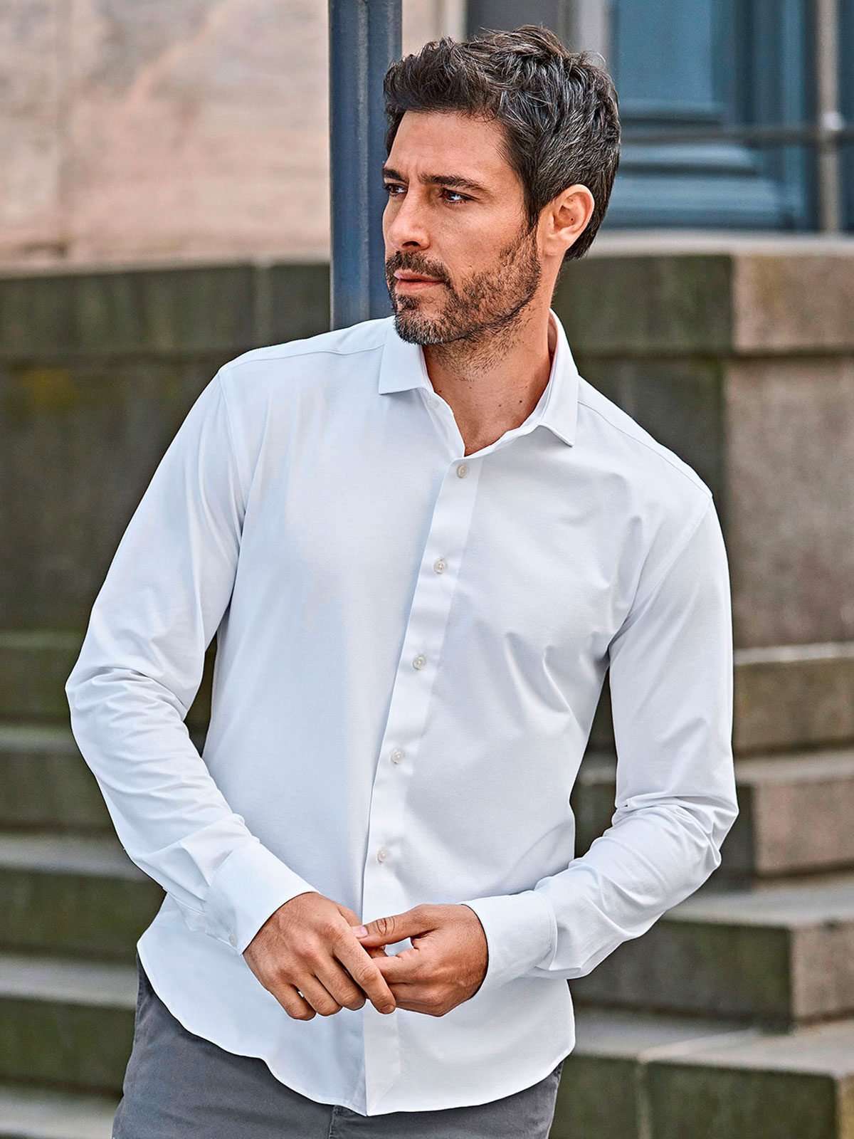 91% cotone 9% elastane. Camicia da uomo in tessuto tipo jersey elasticizzato in quattro direzioni per un massimo confort, taglio sagomato, colletto ampio, carrè posteriore e polsino moderno.