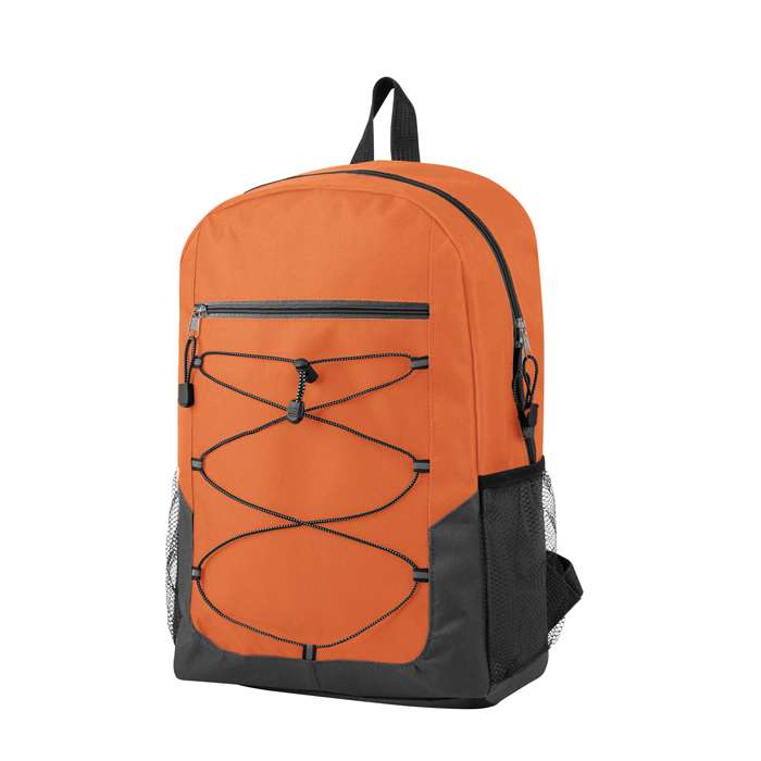 zaino in poliestere 600D; vano interno imbottito; tasca frontale con zip; tasche laterali in materiale traforato; elastici stringenti frontali; spallacci imbottiti e regolabili