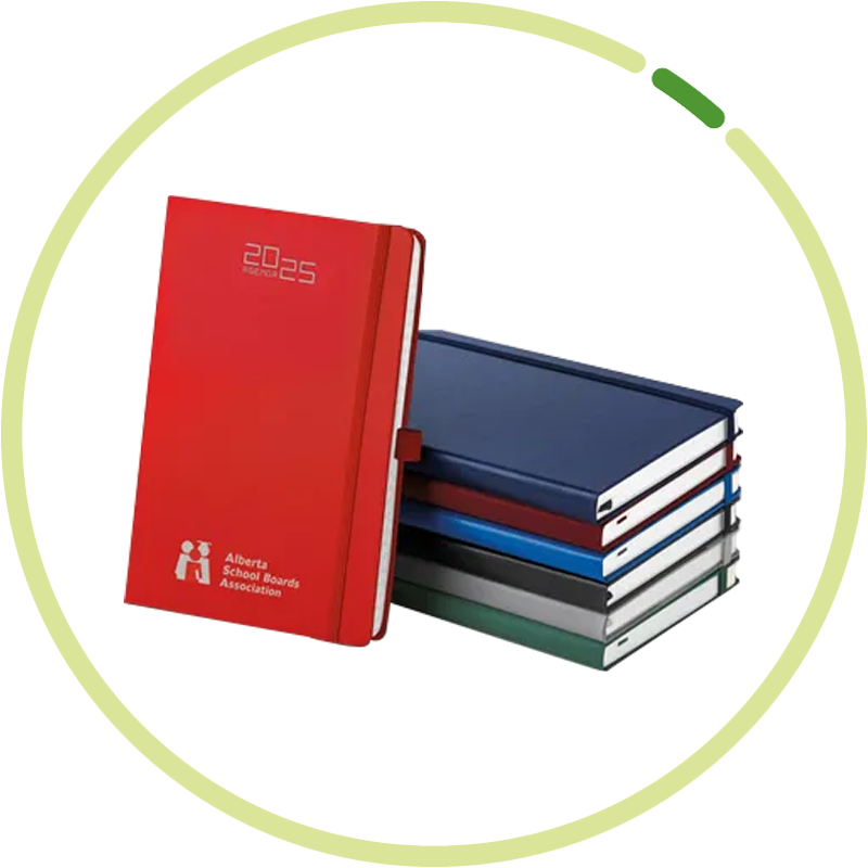 160 pagine neutre; carta bianca; segnapagine in tinta; quadranti ad angoli tondi; chiusura con elastico in tinta; astuccio su richiesta PB609; tecnica di stampa consigliata: serigrafica - UV