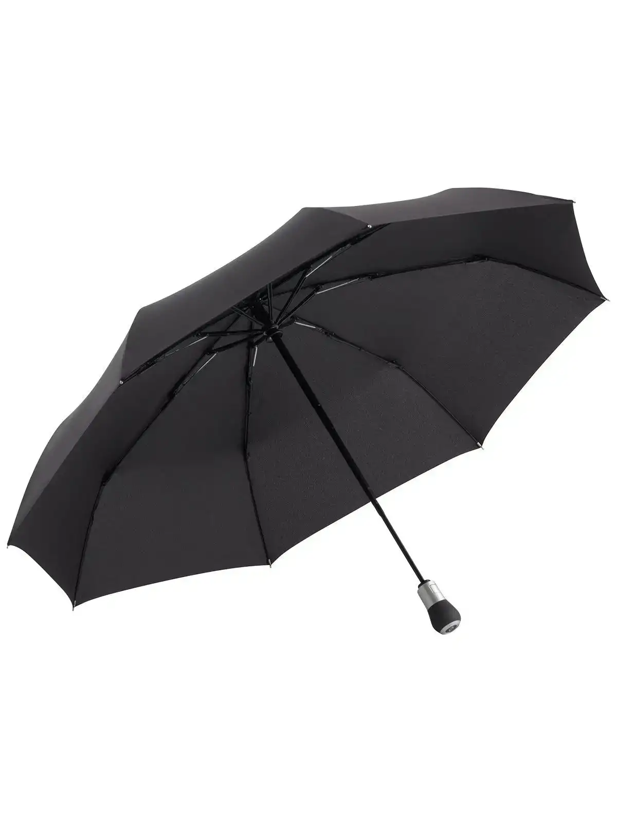 Manico argentato opaco a forma di pulsante con possibilit?? di applicazione della pubblicit?? (p.es. slitta di azionamento), occhiello nella speciale finitura grigio scuro, bastone stabile in fibra di vetro e plastica, pregiate stecche in fibra di vetro e plastica, confortevole doppia funzione automatica per l'apertura e la chiusura rapida, sistema Windproof per una flessibilit?? del telaio massima in caso di forti raffiche di vento, propriet?? della fodera idrofughe e autopulenti grazie al rivestimento in tessuto DuPont??? Teflon?? originale, pratica custodia con bottone a pressione. Diametro: 105 cm, lunghezza da chiuso: 32 cm, 8 pannelli.