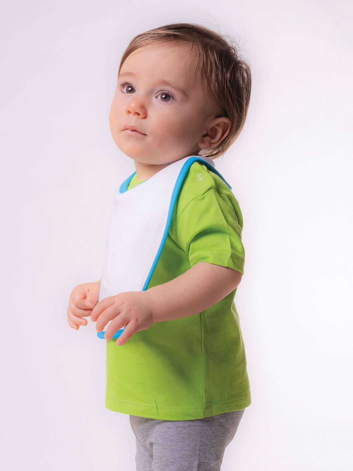 100% cotone. Bavaglio in tessuto a doppio strato e orlo di colore contrastante. Bottone automatico per la chiusura.