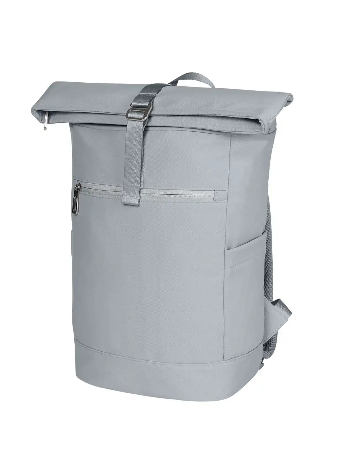 100% poliestere 290D. Zaino roll-top con manico, scomparto principale con cerniera e sistema di chiusura regolabile con fascia ad anello. Accessori metallici di alta qualit??. Tasca imbottita per dispositivi elettronici, tasca anteriore con zip, due tasche a inserto laterali e fondo imbottito. Dimensioni: 25x34x14,5cm. Capacit??: 10litri. Area di stampa: 14x16cm.