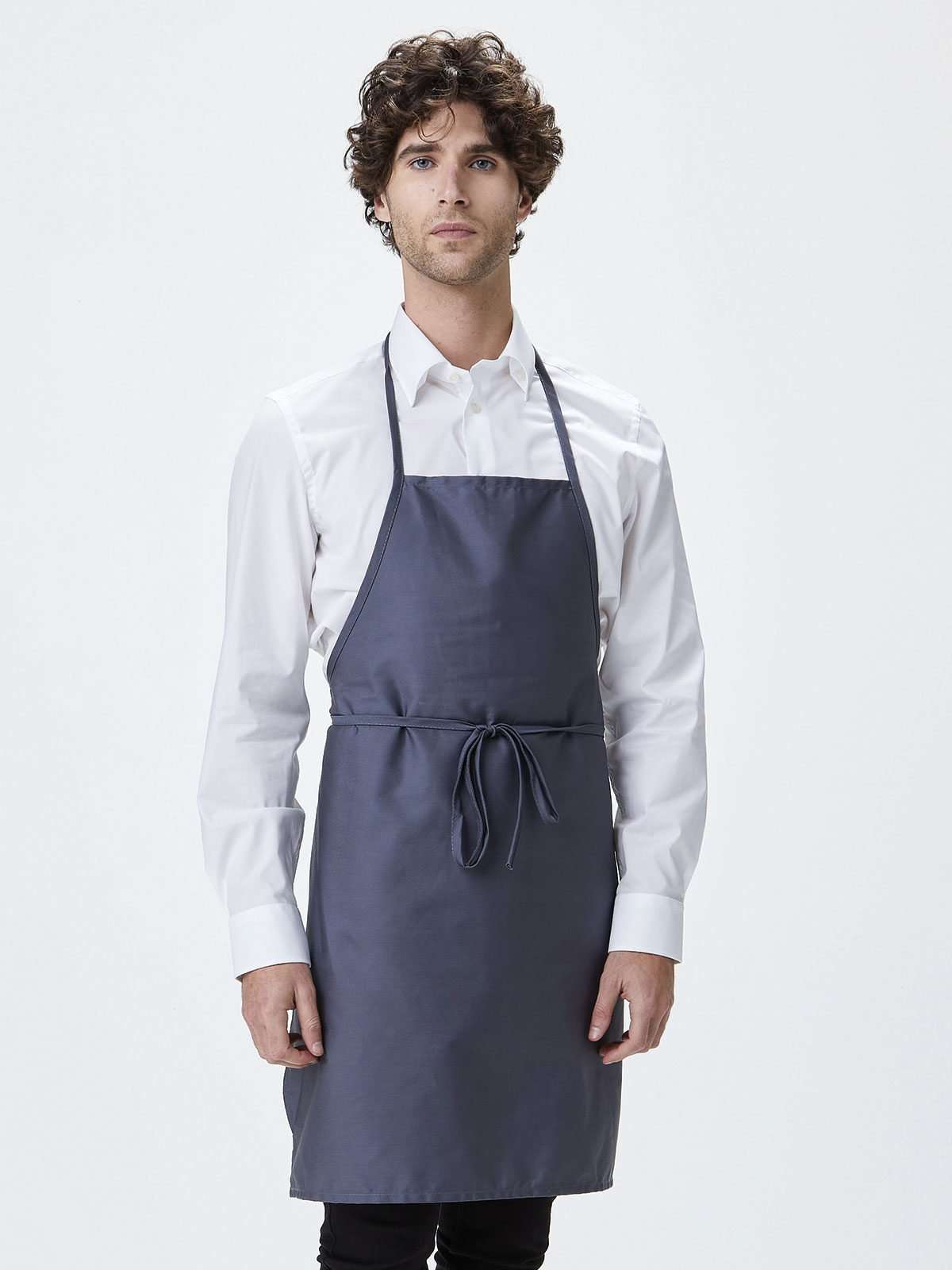 65% poliestere, 35% cotone. Grembiule comodo e avvolgente, senza tasca con lunga cintura. Lavabile a 40°C. Bianco e Natural 100% cotone.