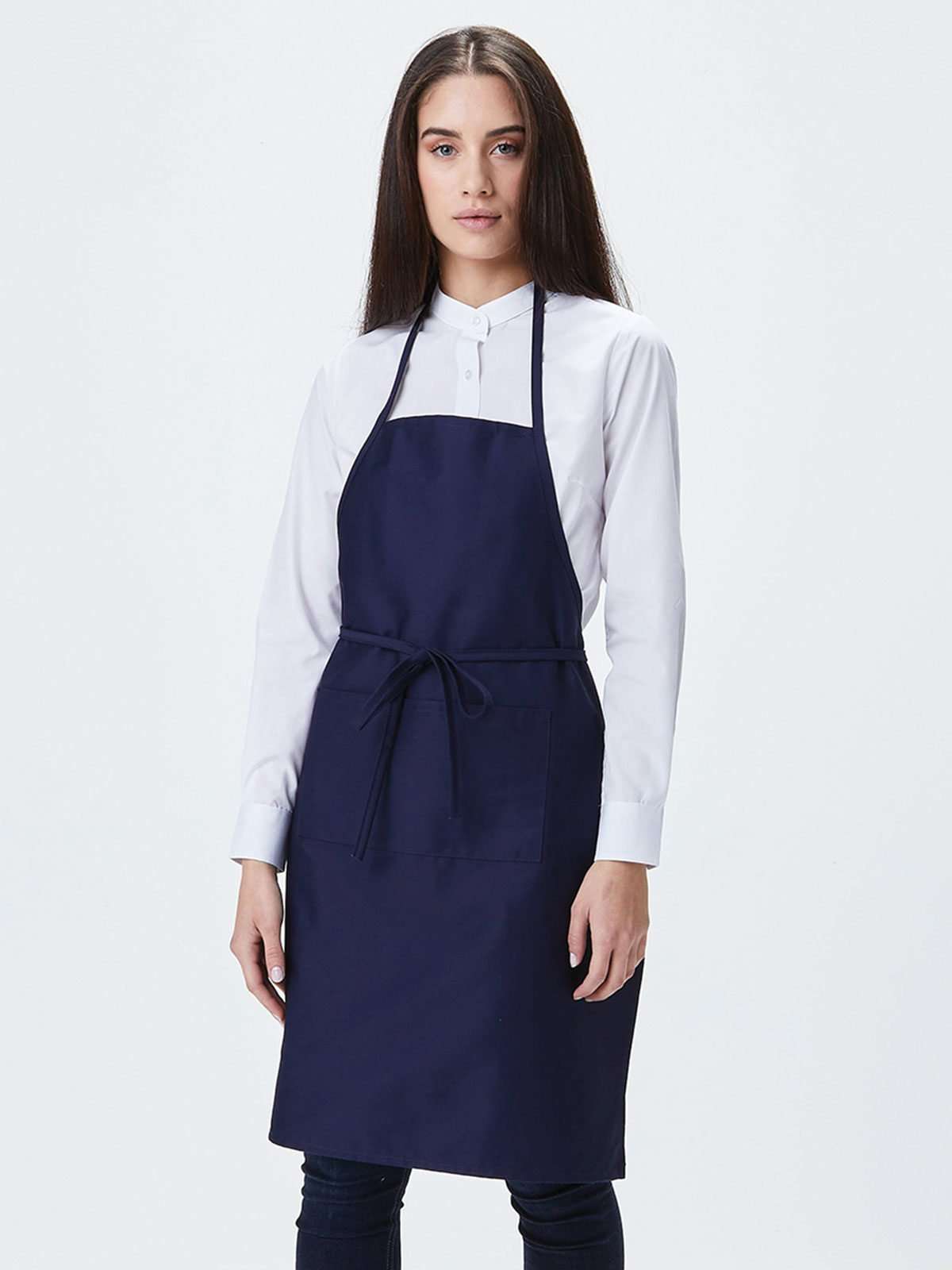 65% poliestere, 35% cotone. Grembiule con comoda tasca centrale e lunga cintura. Lavabile a 40°C. (Col. WH, NA: 100% cot.)