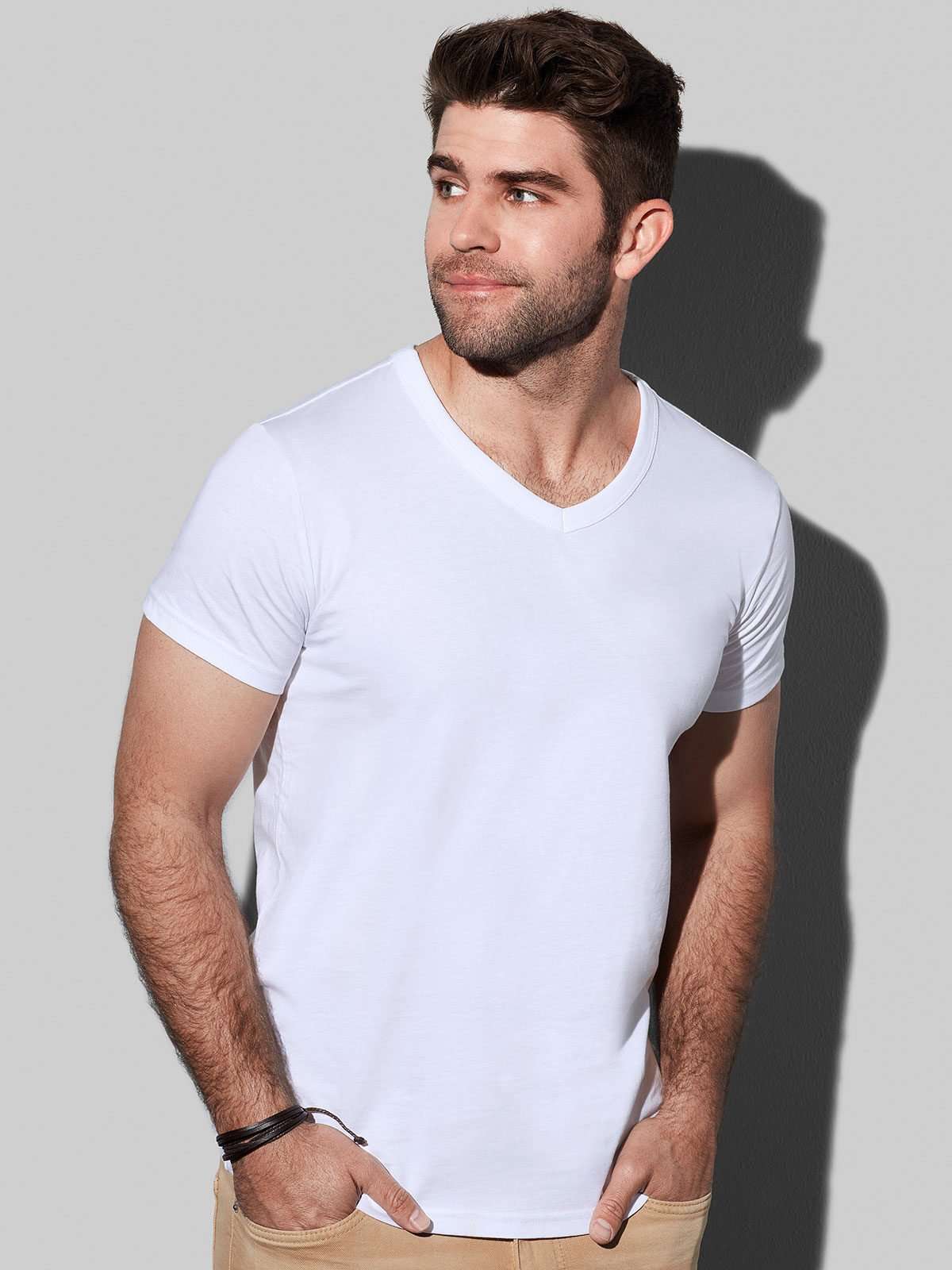 100% cotone filato ad anelli. T-shirt manica corta, set-in, ampio scollo a V con costine, struttura con cuciture laterali, etichetta strappabile. Col. GYH: 85% cot. 15% vis.