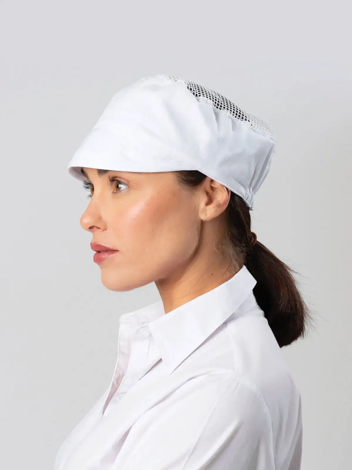 80% poliestere, 20% cotone. Berretto da alimentarista con visiera, rete sulla parte superiore e piccolo elastico sul retro. Lavabile a 40??C.