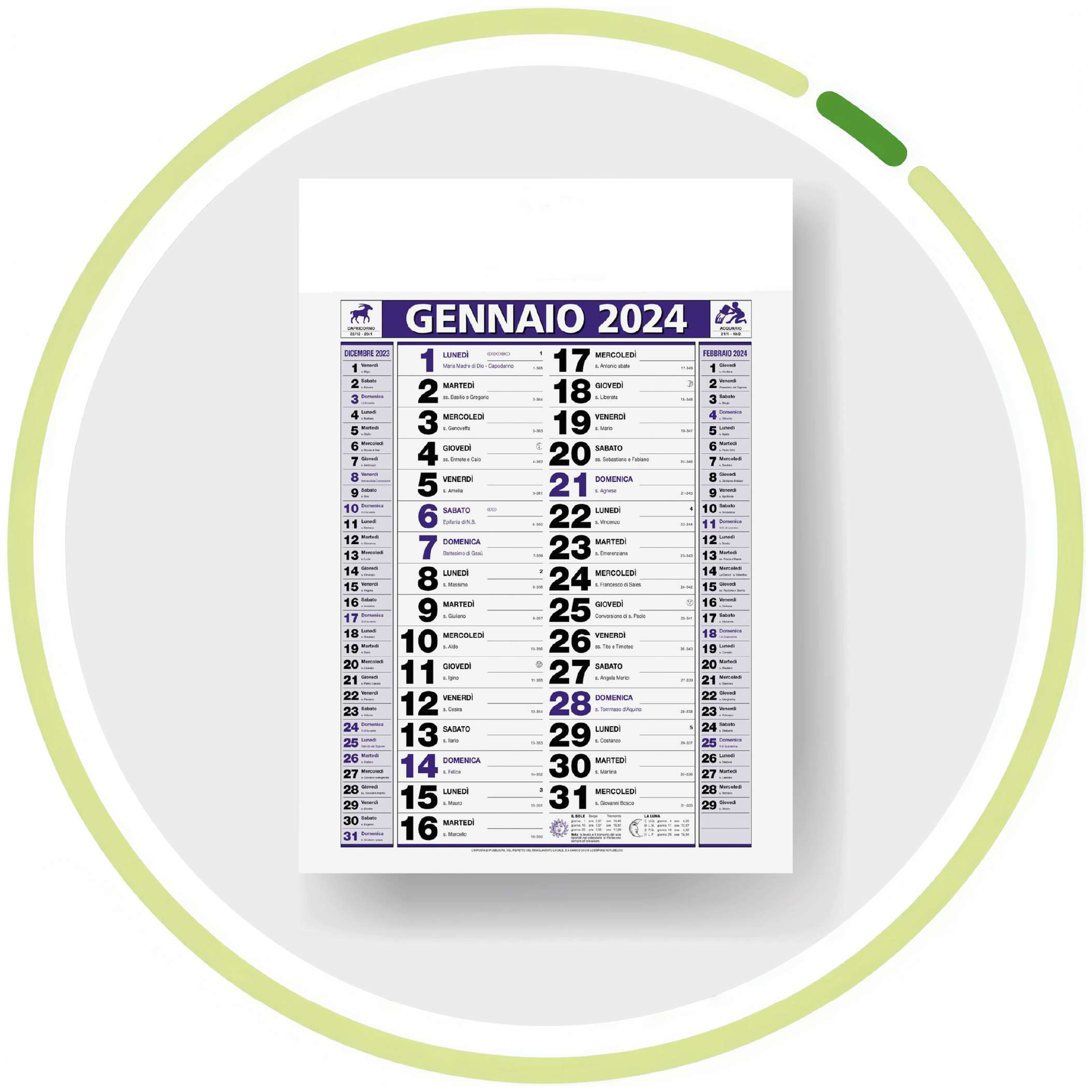 Edizione 2026; olandese mensile 12 fogli; carta patinata 70 gr.; testata termosaldata; festività internazionali; pagina note stampata sul retro; memo spese in ultima pagina; tecnica di stampa consigliata: adesivo digitale - serigrafica