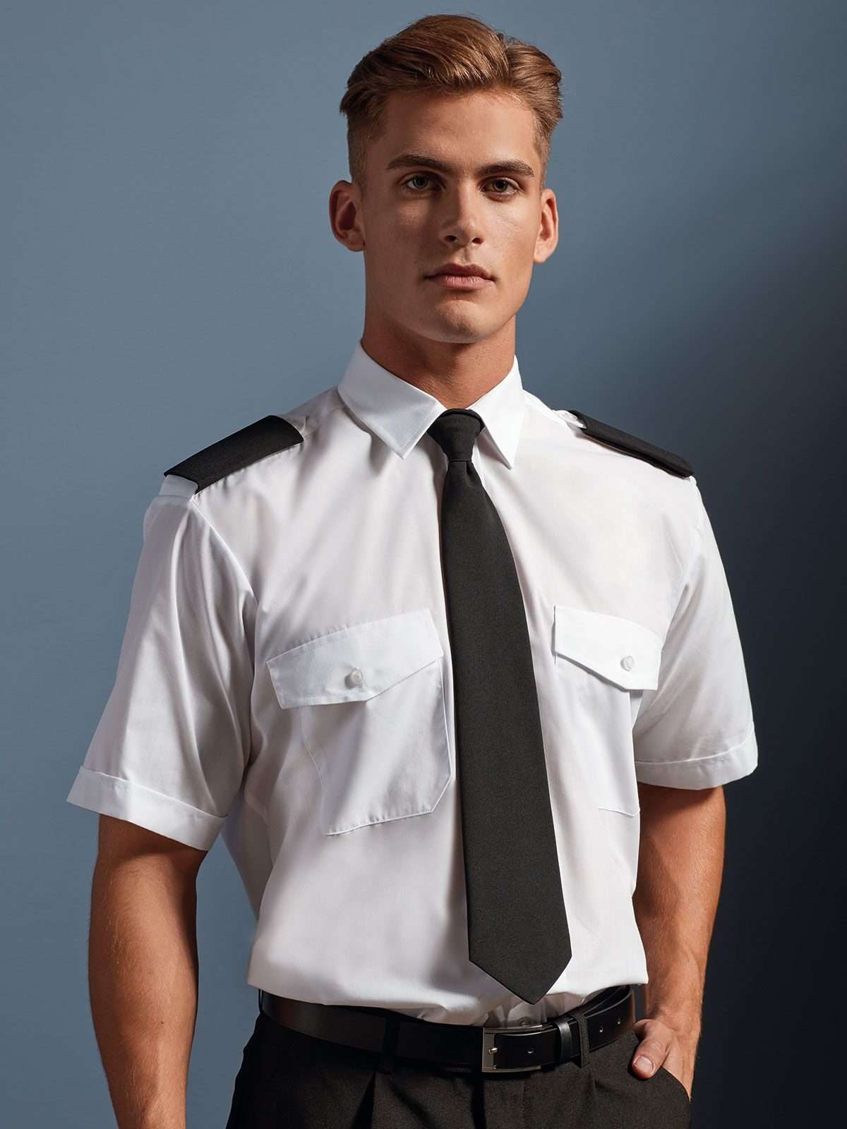 65% Poliestere, 35% Cotone Poplin. Per coloro che richiedono un'uniforme da lavoro più autorevole, questa camicia pilota da uomo a maniche corte è l'ideale in quanto presenta linguette sulle spalle che possono ospitare spalline e dispone anche di due tasche sul petto smussate.• Colletto formale• Due tasche sul petto abbottonate• Tasca portapenne combinata della tasca sul petto a sinistra