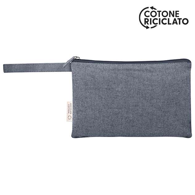necessaire da viaggio in cotone riciclato; chiusura con cerniera lampo; laccio da polso; 200 gr; Tecnica di stampa consigliata: Serigrafica - Transfer