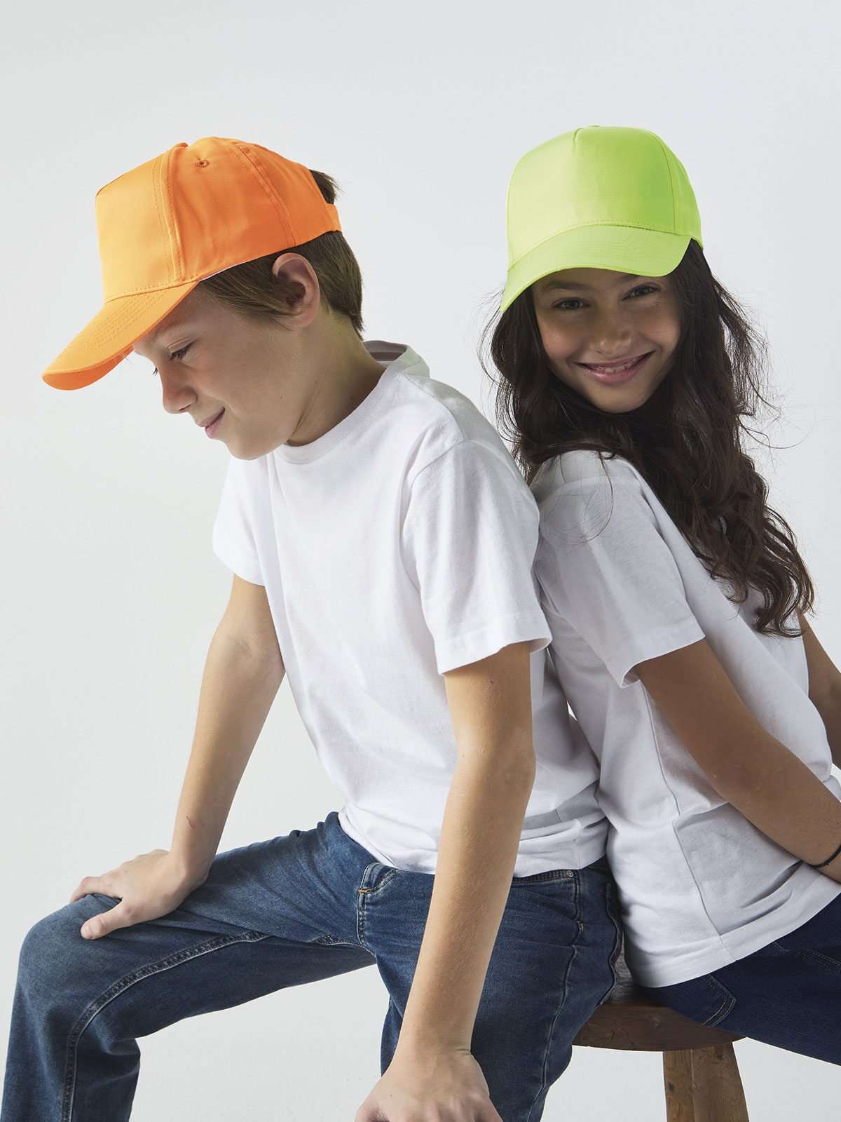 100% cotone. Berretto da bambino a 5 pannelli con chiusura in velcro, fascia anti-sudore in poliestere, occhielli cuciti, pannello frontale rigido, visiera precurvata. Colori fluo e codice colore LO 100% poliestere.