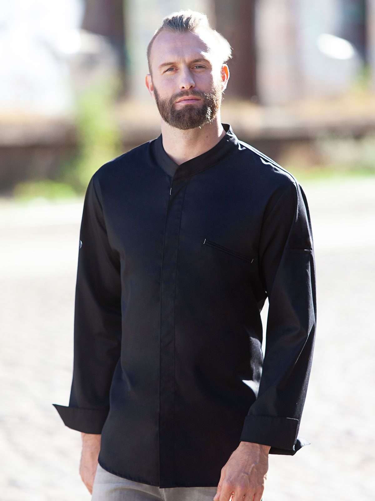 50% poliestere, 50% cotone. 150 g/m². Giacca da cuoco moderno con colletto alto elegante e abbottonatura nascosta, bottoni a pressione, taschino elegante sul petto, manica sinistra con pratica tasca a filetto, polsini con spacchetti laterali. Idonea a lavaggi industriali. Candeggio consentito.