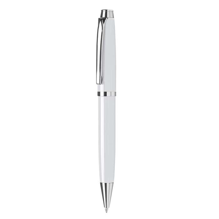 penna a sfera; meccanismo a rotazione; corpo e cappuccio in lacca lucida; minuterie in metallo cromato; refill in metallo con sfera al tungsteno; inchiostro nero; corredata di astuccio; tecnica di stampa consigliata: serigrafica - tampografica - UV - incisione su penna