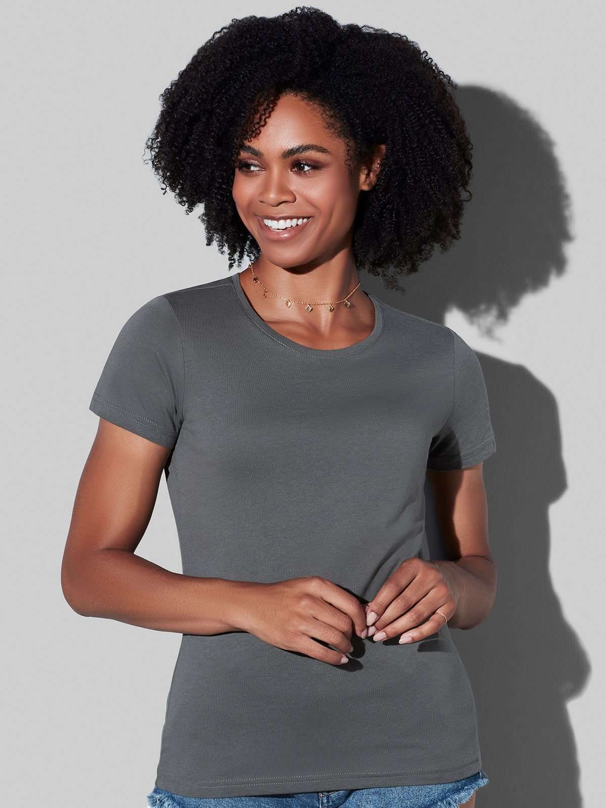100% cotone certificato organico OCS. T-shirt girocollo da donna con maniche corte, collo in tessuto, cuciture rinforzate sulle spalle, cuciture laterali. Col. GYH 85% cot. 15% visc.