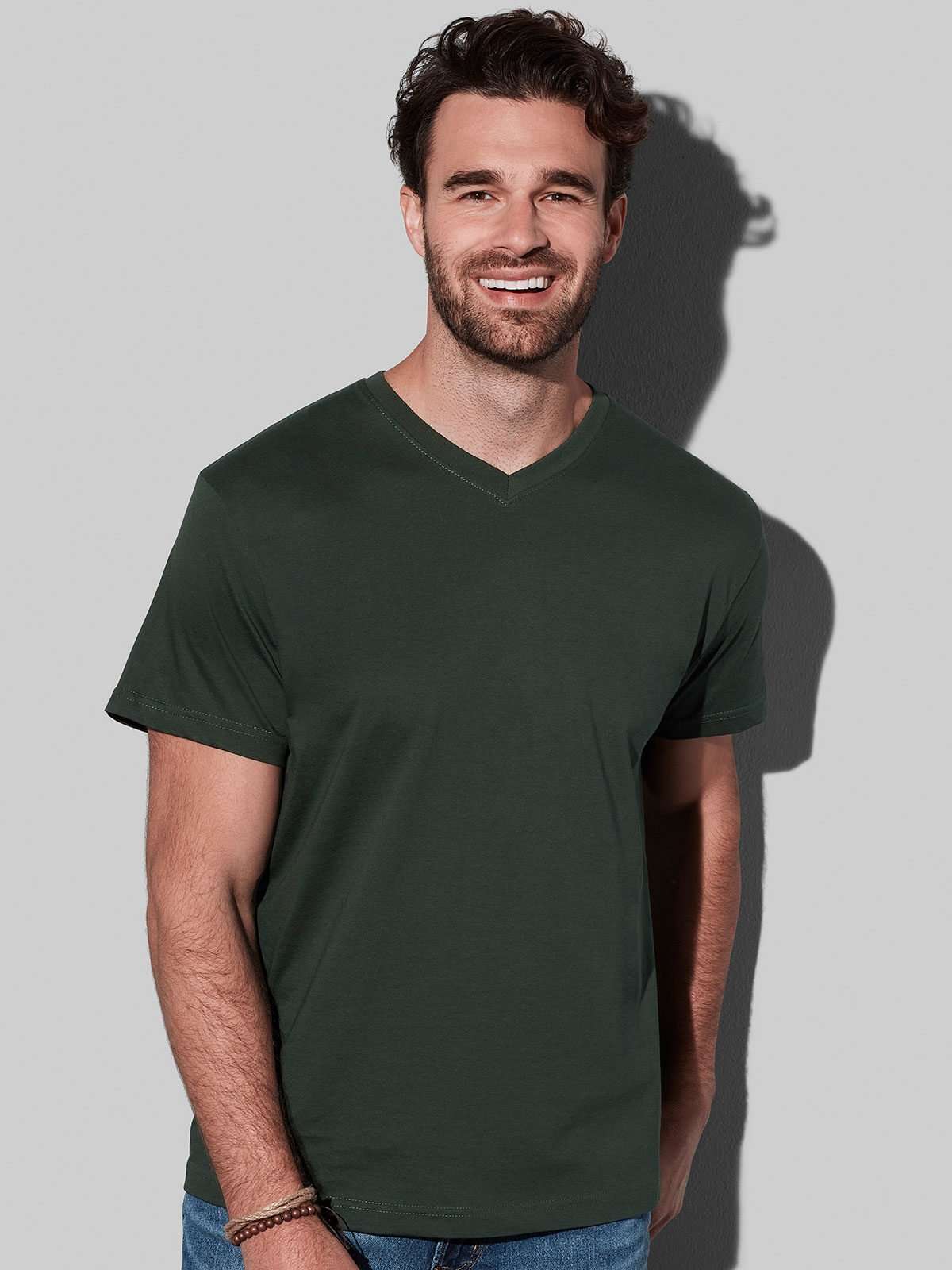 100% cotone single jersey. T-shirt manica corta, set-in, scollo a V. Struttura con busto tubolare, cucitura a doppio ago su collo, maniche e vita, nastro di rinforzo alle spalle. GYH: 85% cot. 15% visc.