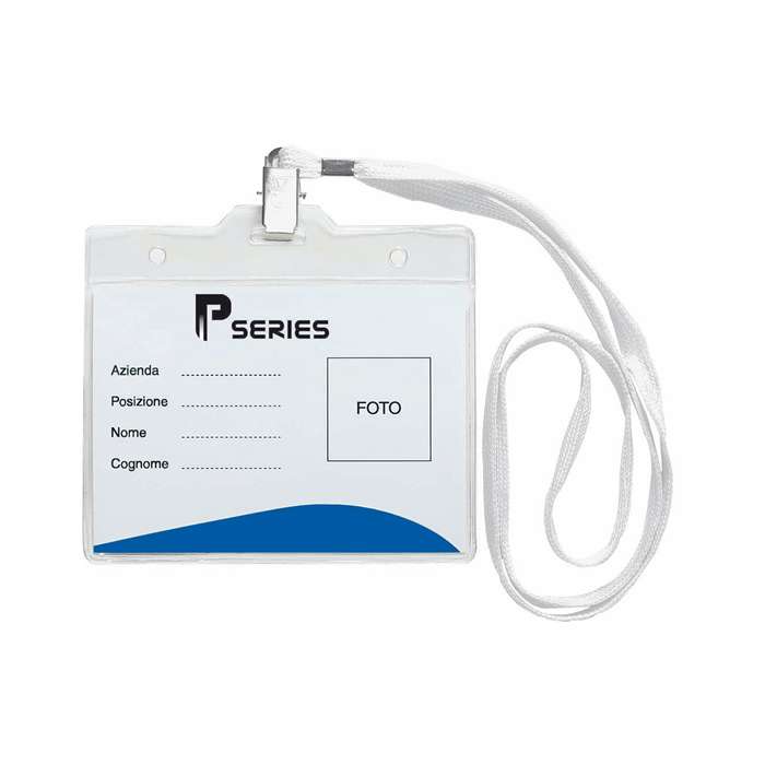 portabadge con nastrino e clip nichelata; cartoncino neutro incluso; tecnica di stampa consigliata: serigrafica