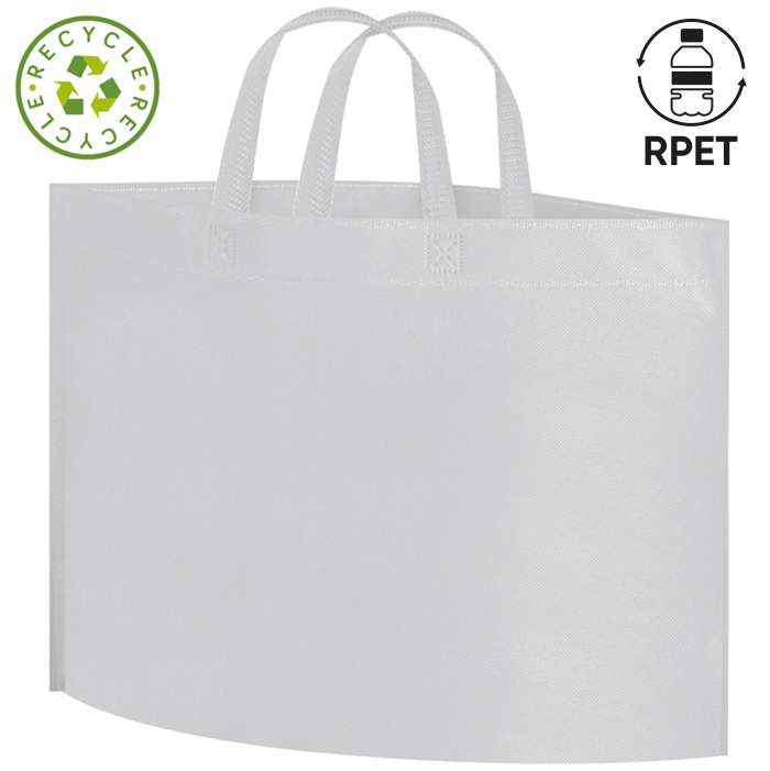 borsa shopping ; manici corti ; rifiniture termosaldate ; borsa eco con 50% pet riciclato ; 100% riutilizzabile e 100% riciclabile ; ottima alternativa alle buste di plastica usa e getta ; pieghevole e spaziosa ; idoneo a contatto con alimenti ; extra resistente portata 18kg ; peso 55gsm ; lavabile in lavatrice ; soft touch ; tecnica di stampa consigliata: serigrafica ; consigli per serigrafia: utilizzare inchiostro polionda, essiccare prima con forno a bassa temperatura e poi asciugare all'aria aperta