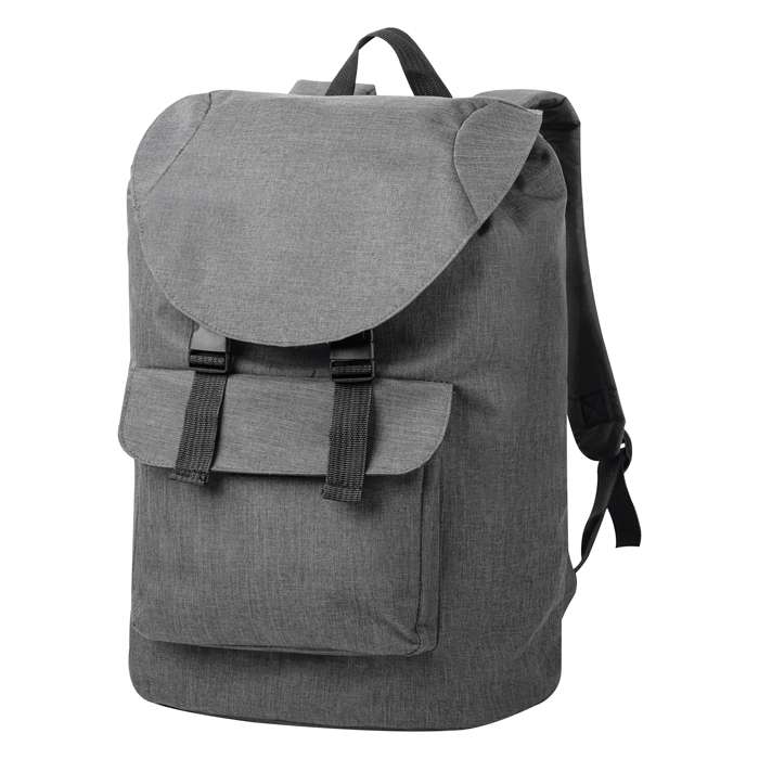zaino in poliestere 300D; effetto melange; tasca frontale; chiusura con fibbie; spallacci imbottiti e regolabili; vano interno porta pc; laptop fino a 15"; Tecnica di stampa consigliata: serigrafica