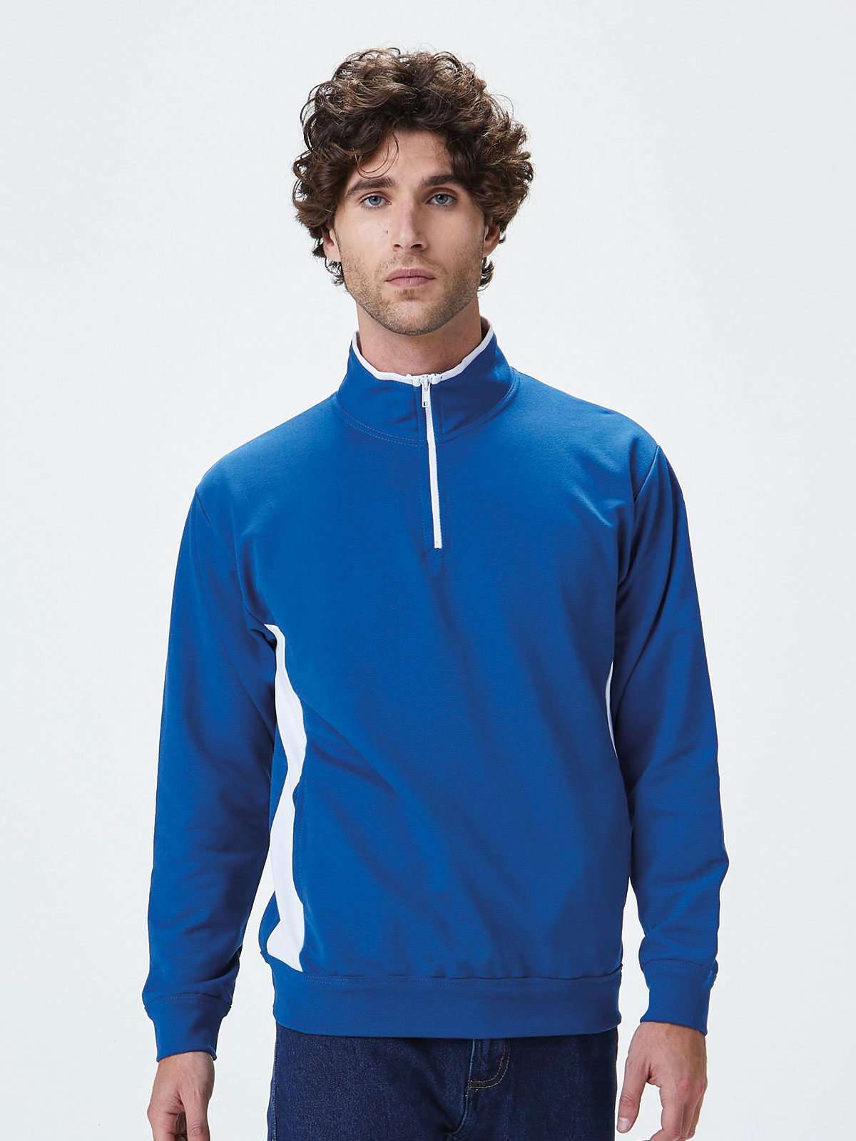 100% cotone. French terry. Felpa mezza zip bicolore parte interna del collo, fianchi, interno tasca e cerniera di colore contrastante. Struttura con cuciture laterali, maniche set-in.