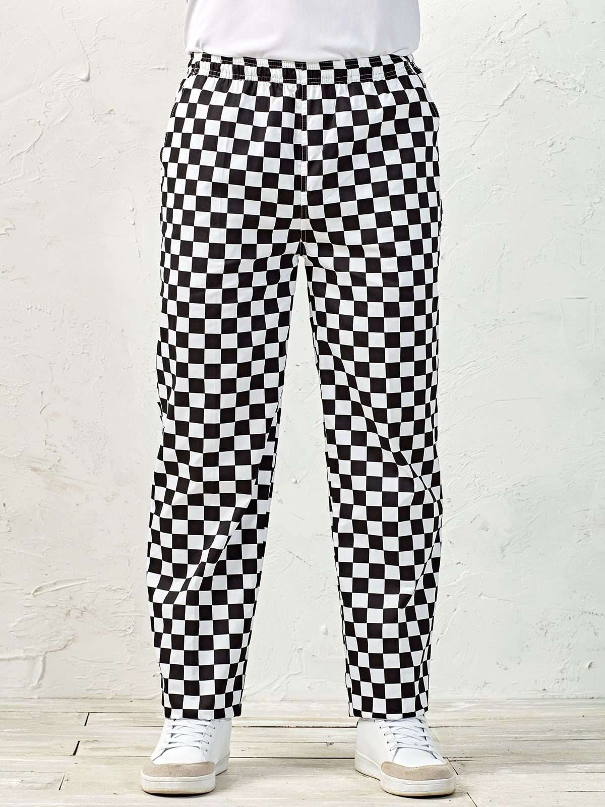 65% poliestere, 35% cotone. Pantaloni da Chef unisex, elastico in vita, comode tasche laterali, patta con zip. Lavabile a 60°C.