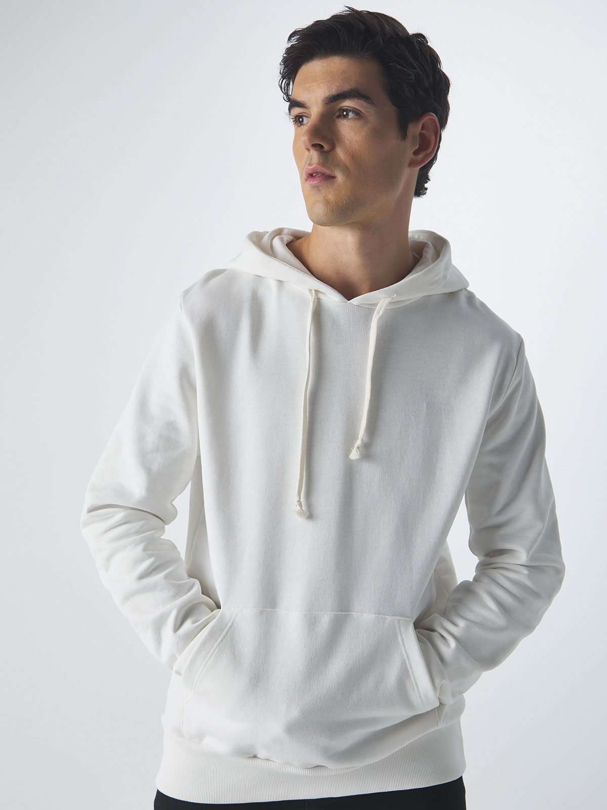 100% cotone pettinato. Felpa con cappuccio doppio, french terry, manica dritta, fit moderno, struttura con cuciture laterali, tasca a canguro, collo senza etichetta, ma con un piccolo adesivo taglia, etichetta composizione, taglia e made in Italy sul fianco. Non felpata internamente. Colore NTR adatto per tinto in capo con cuciture 100% cotone. Prodotta in Italia.