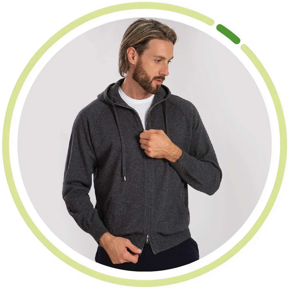 70% cotone, 30% poliestere. Felpa con cappuccio a doppio strato, felpata internamente, maniche set-in, cerniera tono su tono coperta, occhielli in metallo, cordini con punta in metallo, tasca a marsupio, orlo inferiore e polsini in costina, struttura con cuciture laterali. Etichetta strappabile. Tessuto PST: interno in poliestere ed esterno 100% cotone.