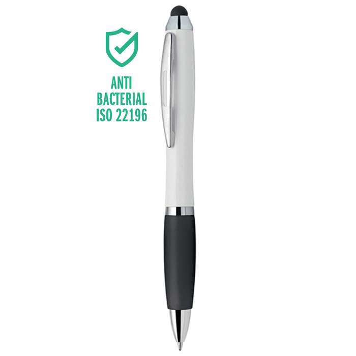 penna a sfera con gommino per touch screen; meccanismo a rotazione; grip in gomma; minuterie in metallo cromato; refill con sfera al tungsteno; inchiostro nero; tecnica di stampa consigliata: tampografica - UV