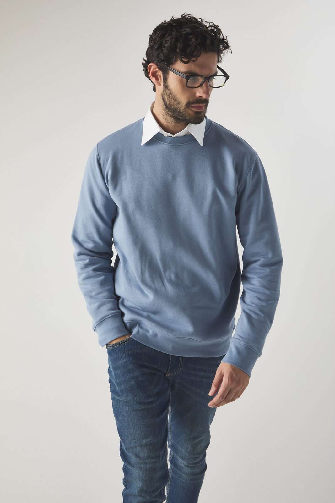 80% cotone organico, 20% poliestere riciclato. Felpa girocollo, genderless, morbido tessuto ecosostenibile trattato ad enzimi, maniche set-in, struttura con cuciture laterali. Collo, fascia in vita e polsini in costina, rinforzo sul colletto. Tessuto interno felpato in poliestere, esterno 100% cotone per una migliore stampabilità. Etichetta taglia tessuta al collo ed etichetta laterale strappabile con logo, composizione e istruzioni di lavaggio.