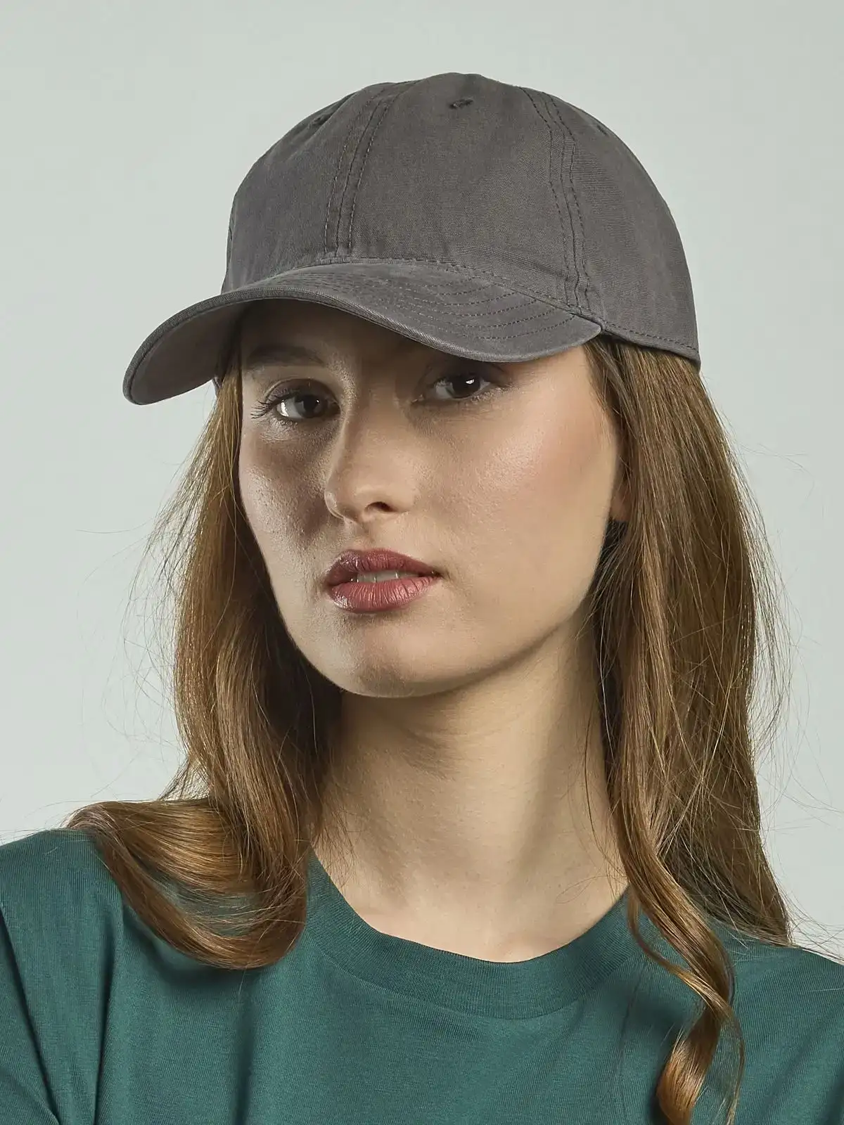 100% Cotone Canvas. Cappellino a 6 pannelli dal look vintage con tessuto effetto lavato. Visiera precurvata, occhielli ricamati, 6 cuciture sulla visiera, chiusura con fibbia in metallo, etichetta removibile.