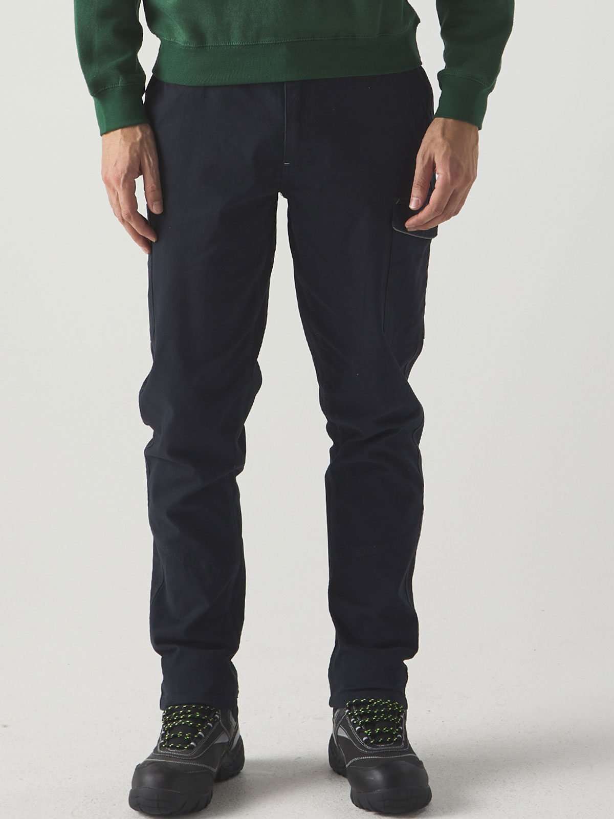 98% cotone, 2% elastane. Pantalone pesante multitasche elasticizzato, certificato CE CAT 1, tessuto prelavato, due tasche anteriori, una tasca laterale con Velcro, una tasca porta metro e portautensili, una tasca posteriore con Velcro. Inserto HiViz nel fianco e nel retro. Due cuciture anteriori sotto il ginocchio, elastici in vita e passanti maggiorati. Etichetta strappabile