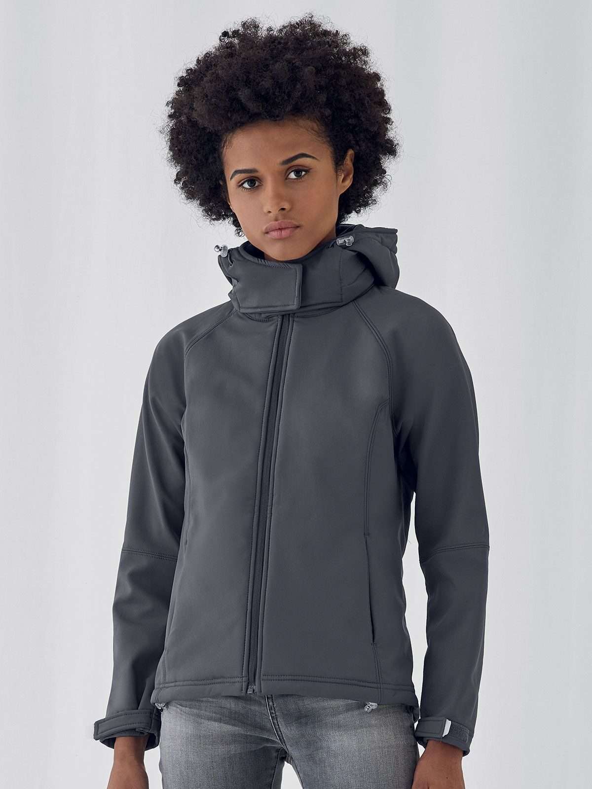 94% polyestere 6% elastane. Giacca tecnica in tessuto a triplo strato (esterno in softshell, interno traspirante, fodera micro-fleece), leggermente sfiancata, maniche raglan, cappuccio removibile con zip e regolabile con elastico, 2 tasche frontali con cerniera.