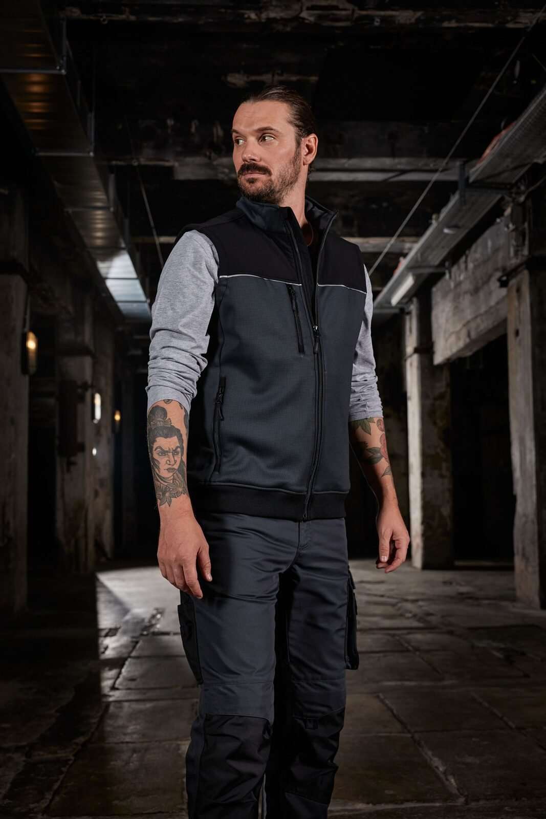 96% poliestere, 4% elastan. Gilet da lavoro in softshell a 2 strati con imbottitura Sherpa, un inserto sul fronte sul retro per facilitare la decorazione, idrorepellente e antimacchia grazie al BIONIC-FINISH®ECO, zip lunga, collo alto con protezione per il mento, polsini elasticizzati, varie tasche, elementi riflettenti (senza funzione protettiva/senza DPI) sul davanti e sul retro, zip: YKK