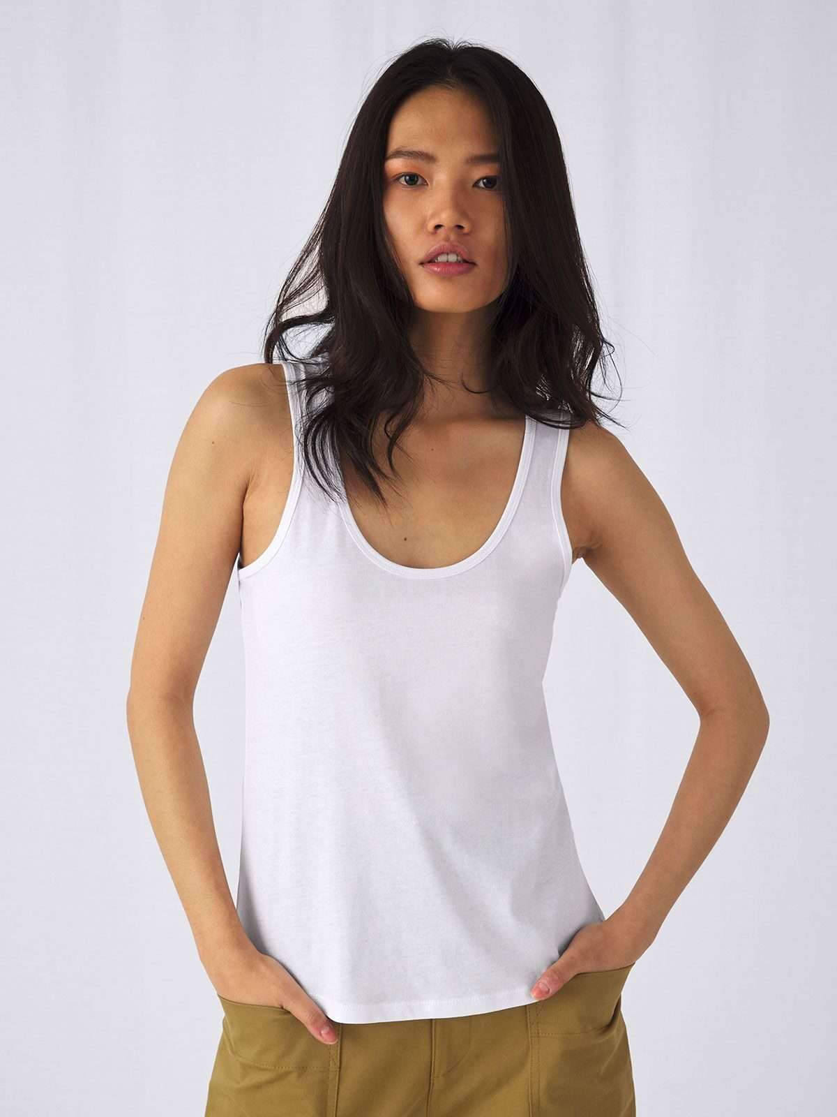 100% cotone organico o organico in-conversion ring-spun. Canotta, girocollo profondo, morbidissima al tatto. Leggermente sfiancata, etichetta strappabile. Col. SG620: 90% cot.