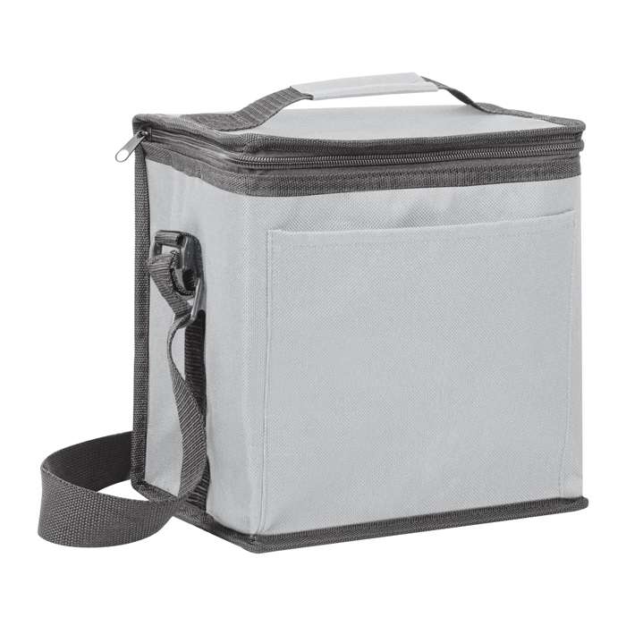 borsa frigo in poliestere 600D; tasca frontale; tracolla regolabile; chiusure con zip; capienza 7 lt