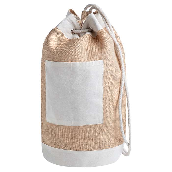 sacca zaino juta e cotone; tasca frontale in cotone; chiusura con corda; Tecnica di stampa consigliata: Serigrafia - Transfer