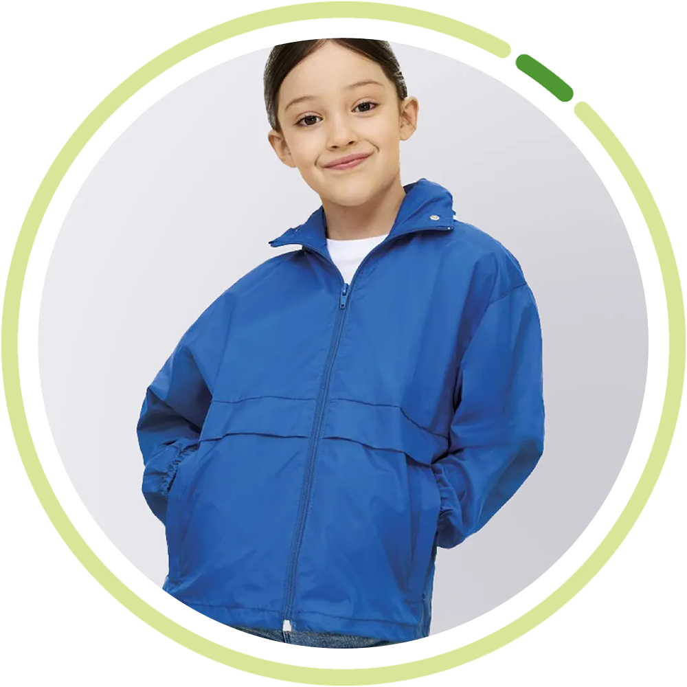 100% nylon. Giacca antivento richiudibile nella tasca, cappuccio a scomparsa, due tasche con cerniera, zip intera tono su tono, polsini elastici, cordoncino regolabile nell'orlo inferiore, fori di areazione.