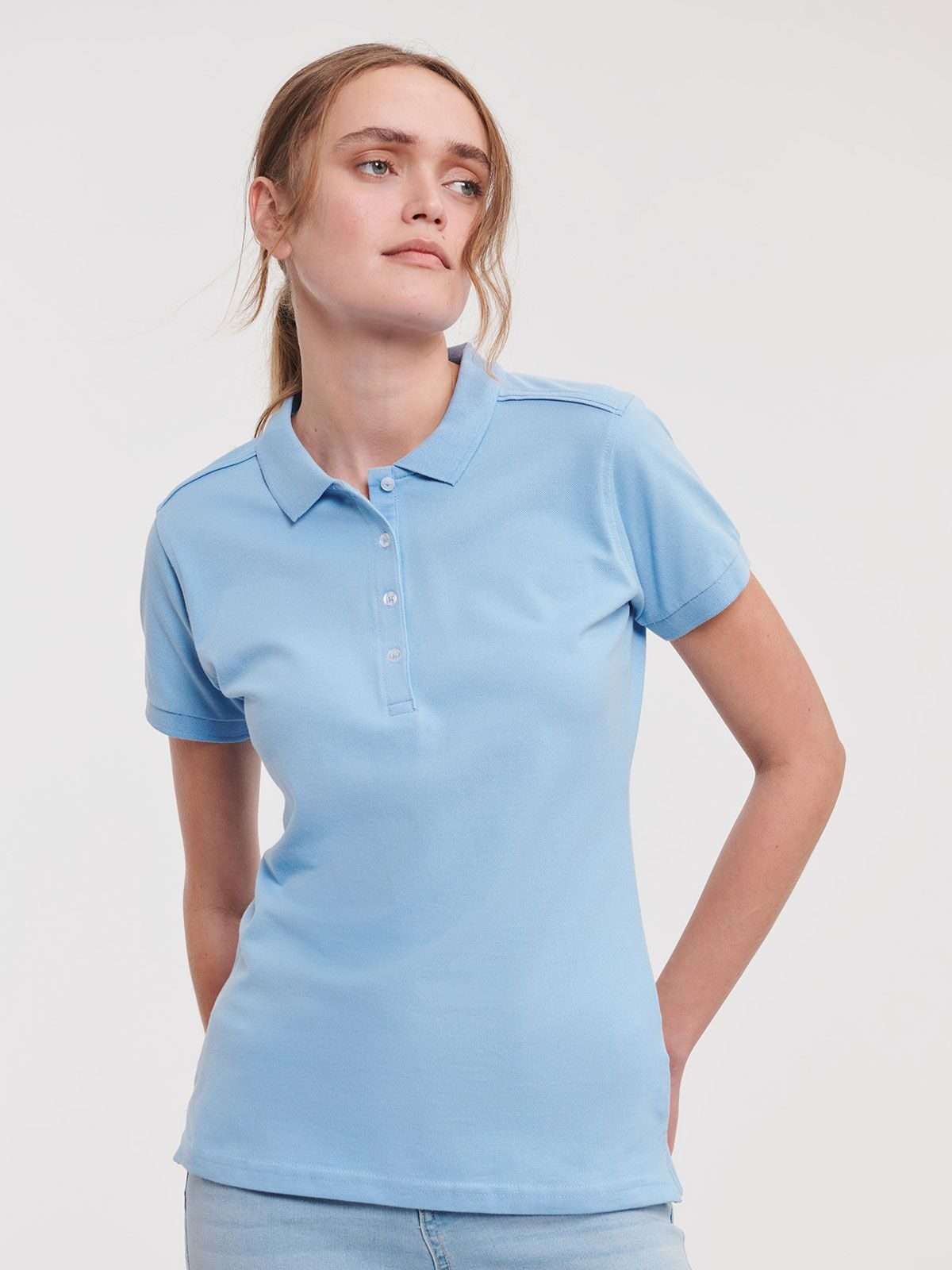 95% cotone, 5% lycra. Polo a maniche corte set-in, morbida al tatto, 4 bottoni a contrasto, colletto con risvolto sottile, maniche con costine, struttura con cuciture e spacchetti laterali, leggermente sfiancata. Light oxford: 88% cot. 7% vis. (White: 205 g/m²).