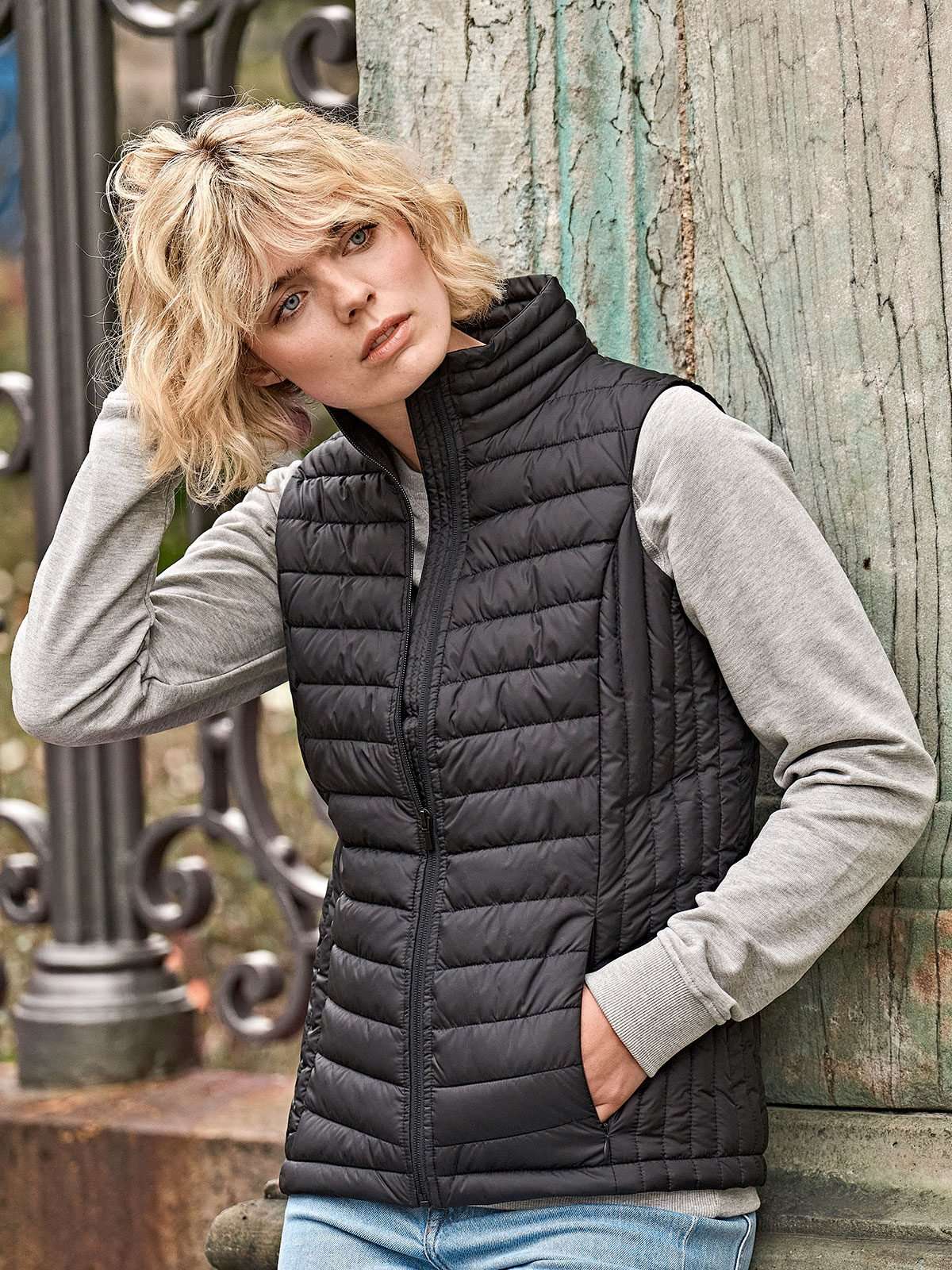 100% poliestere (300T), imbottitura e fodera: 100% poliestere. Giacca donna smanicata con zip, antivento, idrorepellente, tasca interna per la decorazione, tasche laterali con zip