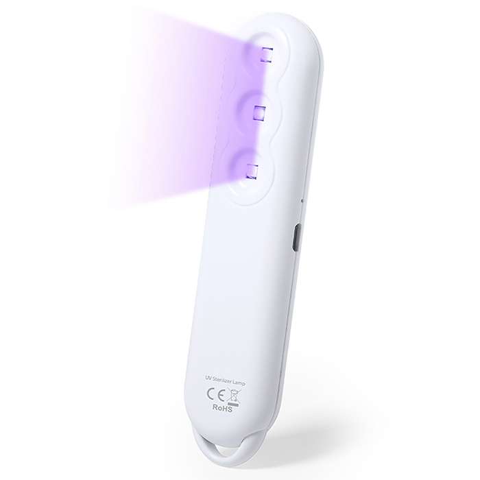 lampada sterilizzatrice ultravioletta ; elimina i microrganismi da smartphone, carrelli della spesa, chiavi ; batteria ricaricabile integrata ; lampadina 1,5 W, lunghezza d'onda 275 nm e tensione 3 V, ; cavo USB incluso