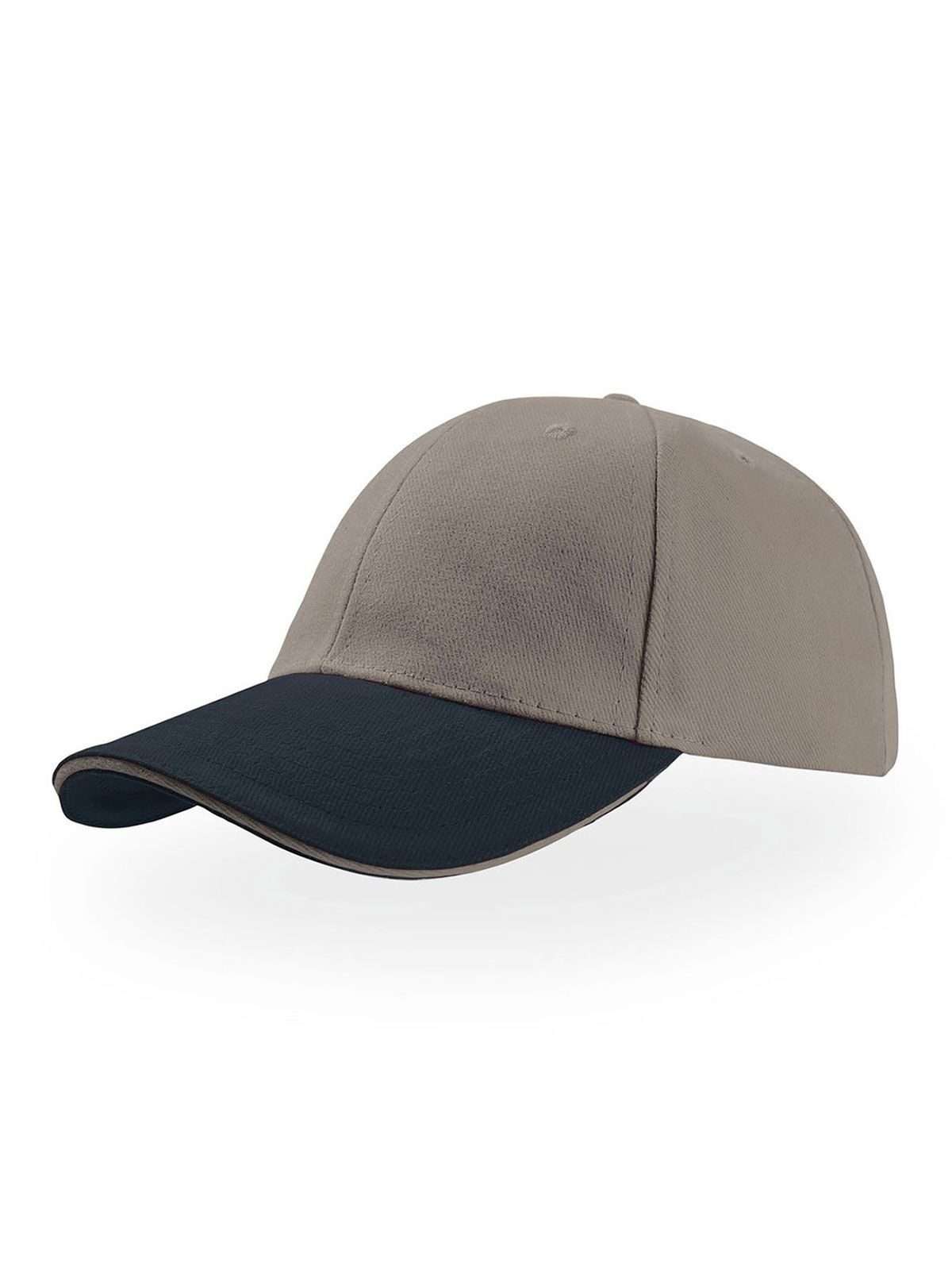 100% cotone. Cappellino a 6 pannelli, visiera tipo sandwich con inserto a contrasto, chiusura con cinturino passante su fibbia in metallo, occhiello ricamato, etichetta removibile, taglia unica.