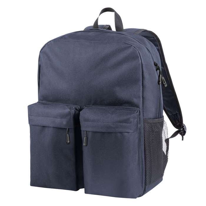 zaino in poliestere 600D; tasche laterali in materiale traforato; due tasche frontali; compartimento interno; retro imbottito; spallacci regolabili