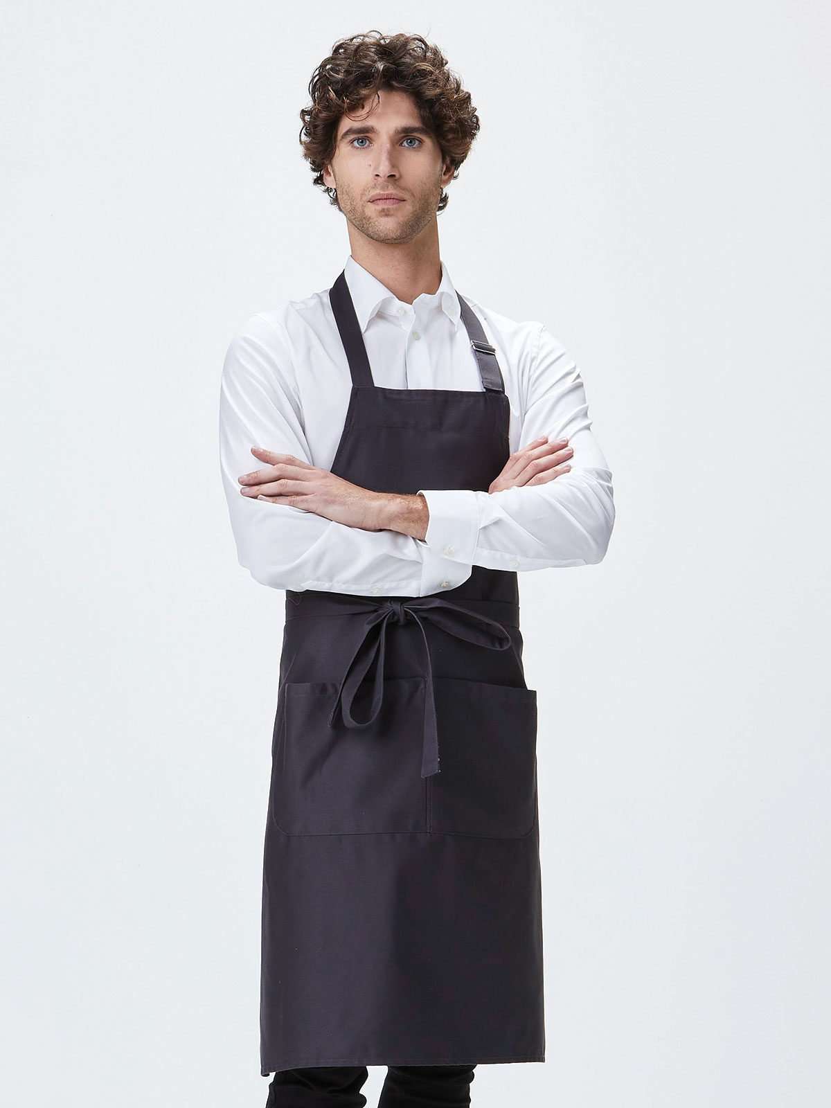 65% poliestere, 35% cotone. Grembiule con pettorina, ampia tasca frontale a 2 scomparti, regolabile con fibbia di metallo.