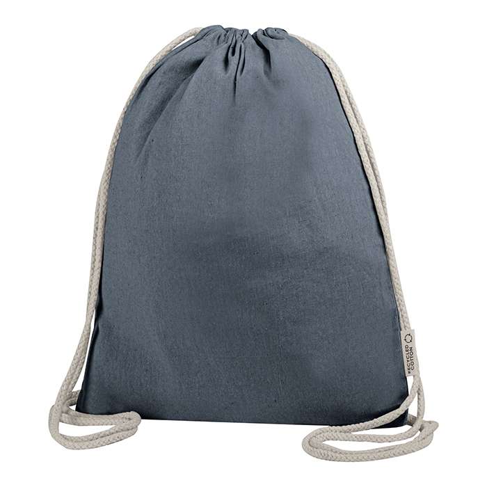 sacca zaino 100% cotone riciclato; doppia corda di chiusura; rifiniture cucite; tecnica di stampa consigliata: serigrafica - transfer; 150 GR