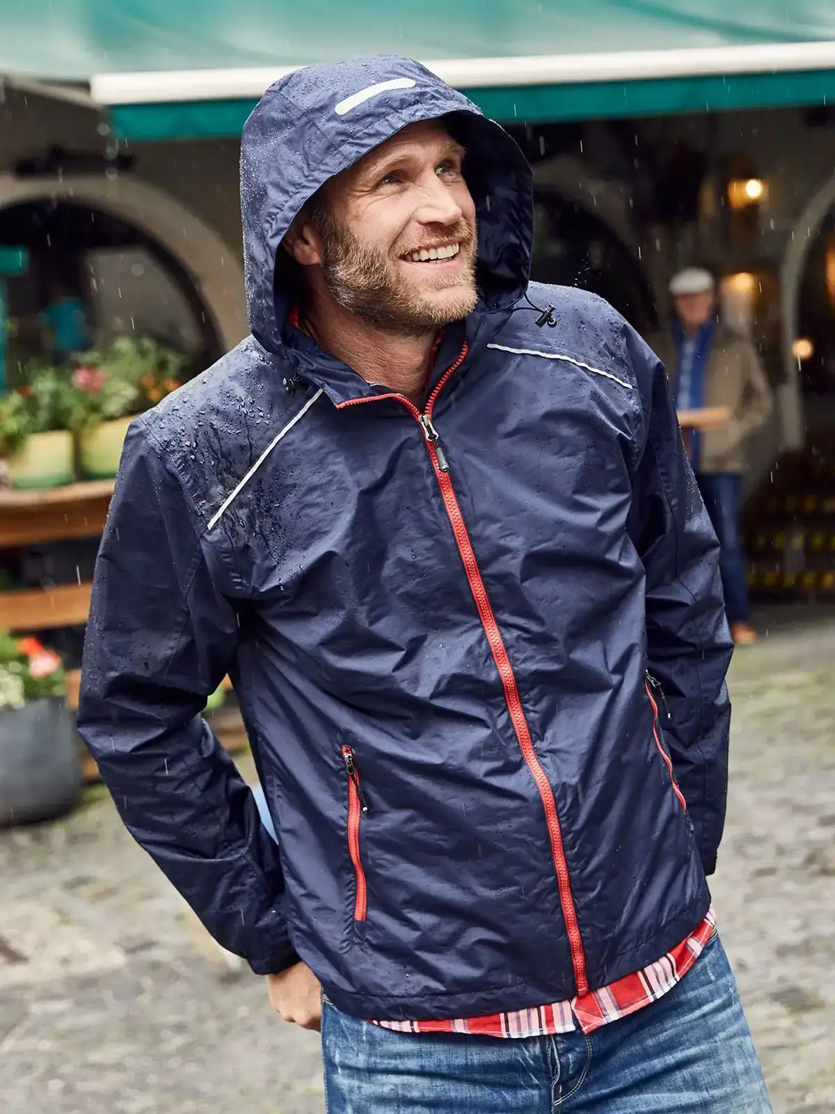 100% poliestere. Giacca da pioggia, casual e funzionale, Tessuto funzionale a 3 strati con membrana TPU. Antivento e idrorepellente (colonna d'acqua 3.000 mm), traspirante e permeabile al vapore (1,500g/m??/24 h), Cuciture nastrate, Zip a contrasto, Zip frontale a scomparsa con protezione per il mento, Cappuccio regolabile con cordino elastico, 2 tasche laterali con zip, Tasca interna, Dettagli riflettenti sul cappuccio e nelle parti frontali e posteriori, Zip per la decorazione sul retro. Tessuto esterno: 100% poliestere, Fodera: 100% poliestere, Velcro, Manica lunga, Fodera in rete, Cuciture sigillate, Colonna d'acqua 3.000 mm