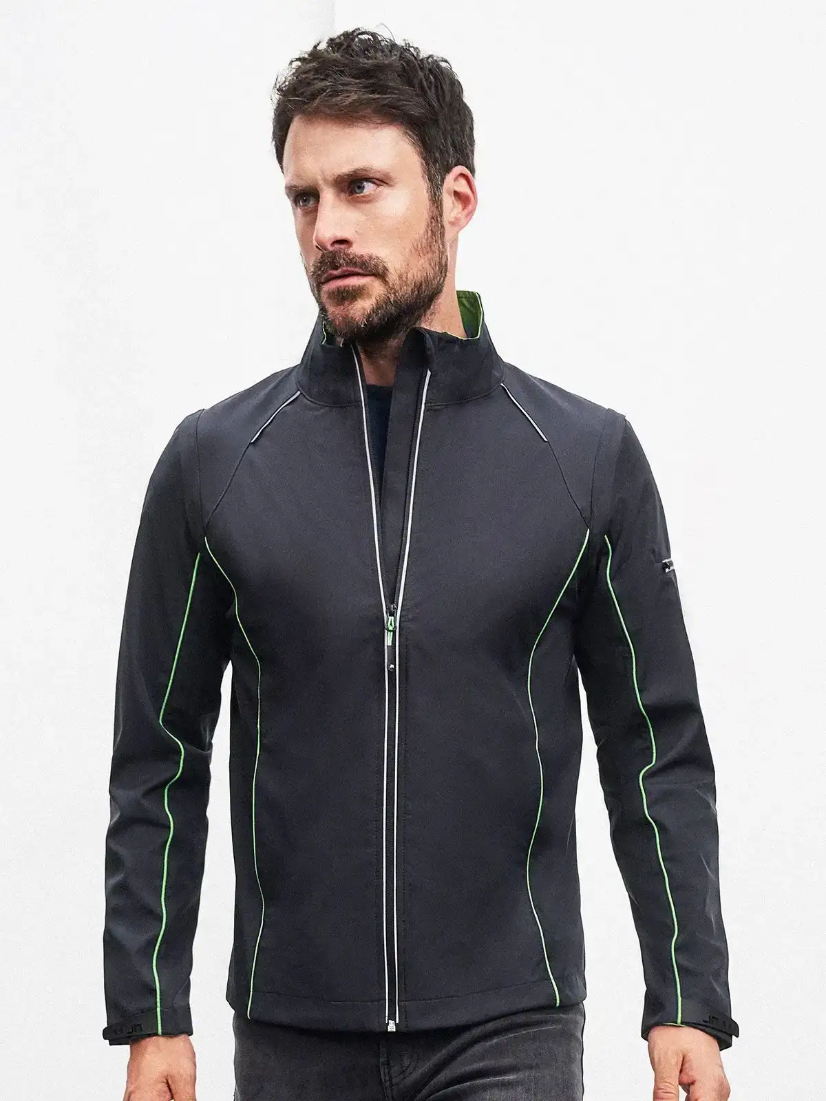 100% poliestere. Giacca in softshell con tessuto a 3 strati, membrana TPU, antivento e idrorepellente (colonna d'acqua 5.000 mm), traspirante e permeabile al vapore. Collo alto, piping a contrasto sul davanti, sul retro e sulle maniche. Cerniera anteriore nascosta, dettagli riflettenti su spalle, retro e maniche. due tasche laterali con zip, una tasca interna, tasca sulla manica con zip riflettente. Maniche staccabili.