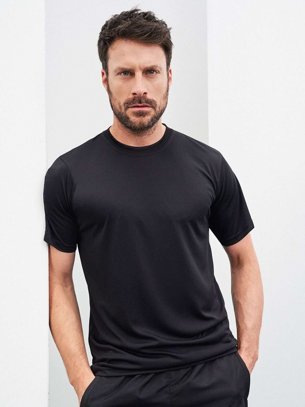 100% poliestere. T-shirt per il tempo libero e lo sport. Fine single jersey, forma diritta, necktape, cuciture a doppio ago sulle spalle, collo e maniche, Traspirante, regola l'umidità, ad asciugatura rapida. Tessuto esterno (150 g/m²). Manica corta, collo rotondo.