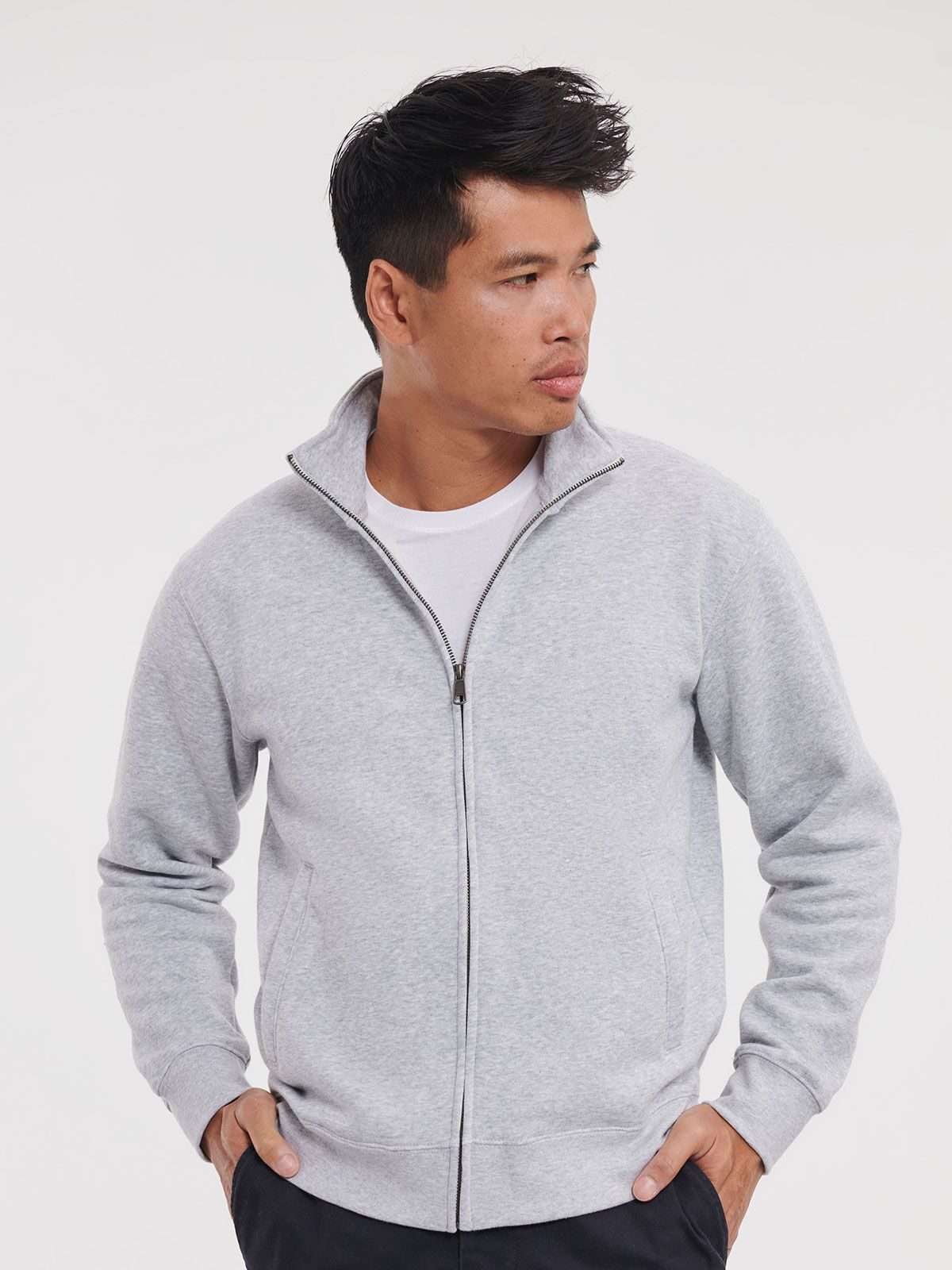 80% cotone ring-spun, 20% poliestere. Felpa con maniche set-in, tessuto a 3 strati, nastro di rinforzo al collo. Giromanica, polsini e orlo inferiore con cuciture coperte, due tasche frontali, zip intera in metallo, felpata internamente, struttura con cuciture laterali.