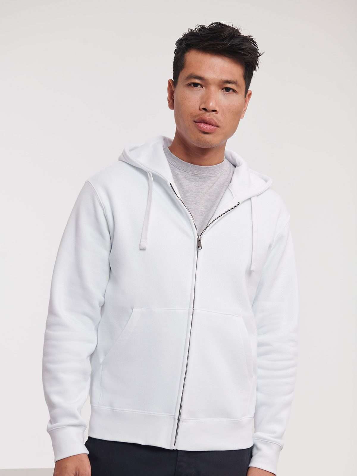 80% cotone ring spun 20% poliestere. Felpa con cerniera, maniche set-in, tasca a marsupio, nastro di rinforzo al collo. Felpata internamente, struttura con cuciture laterali.