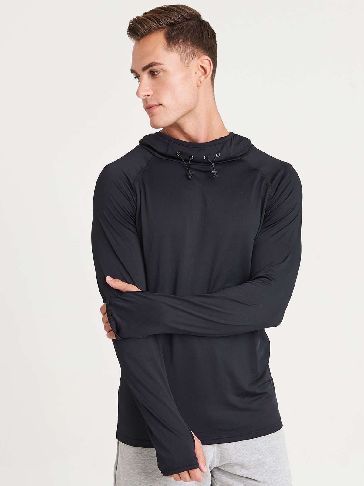 92% poliestere 8% elastan. Maglia da uomo con cappuccio, collo ad anello, maniche raglan, elementi riflettenti sul cappuccio, cuciture piatte, etichetta strappabile.